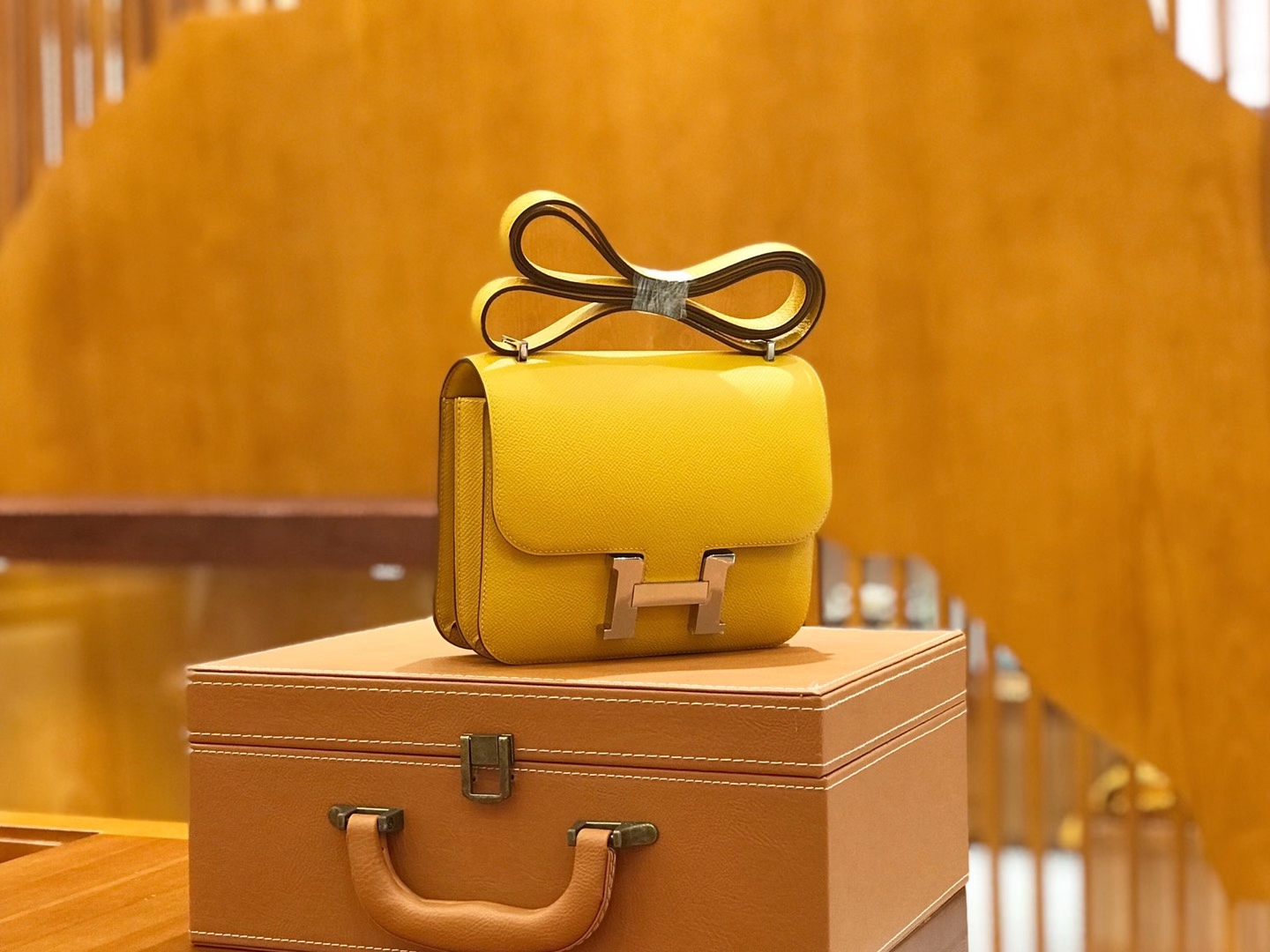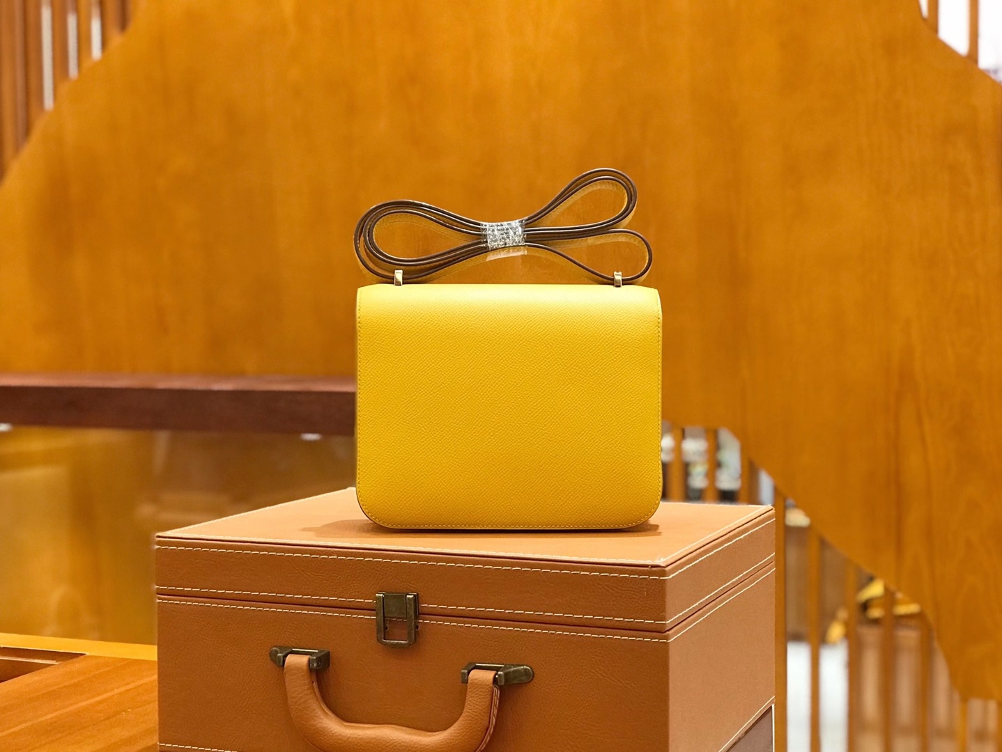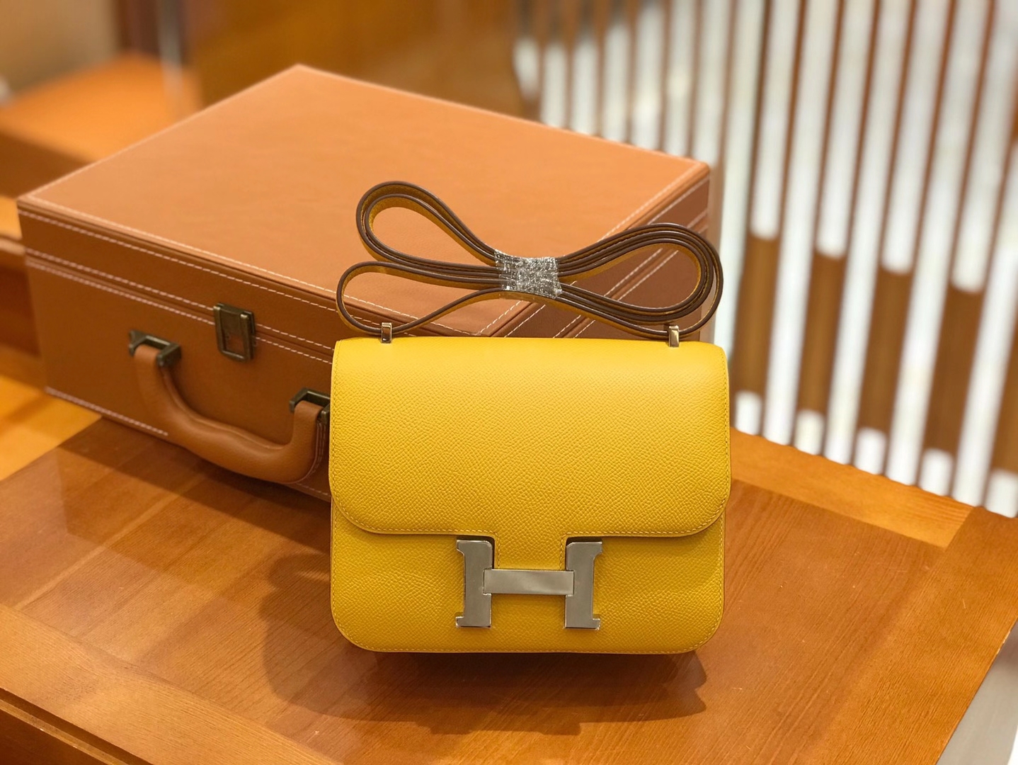 Hermès(爱马仕)Constance 18cm 进口掌纹牛皮 9D琥珀黄 银扣 全手工缝制 高订鳄鱼工序工 2020年10月30日 0 爱马仕包包官网 Constance 18CM Constance 空姐包 Epsom 品牌:Hermès(爱马仕);类别: Constance 空姐包;颜色:琥珀黄;材质:Epsom 掌纹小牛皮;等级:顶级;附件:全套包装礼盒;尺寸:18cm;功能:手提单肩包